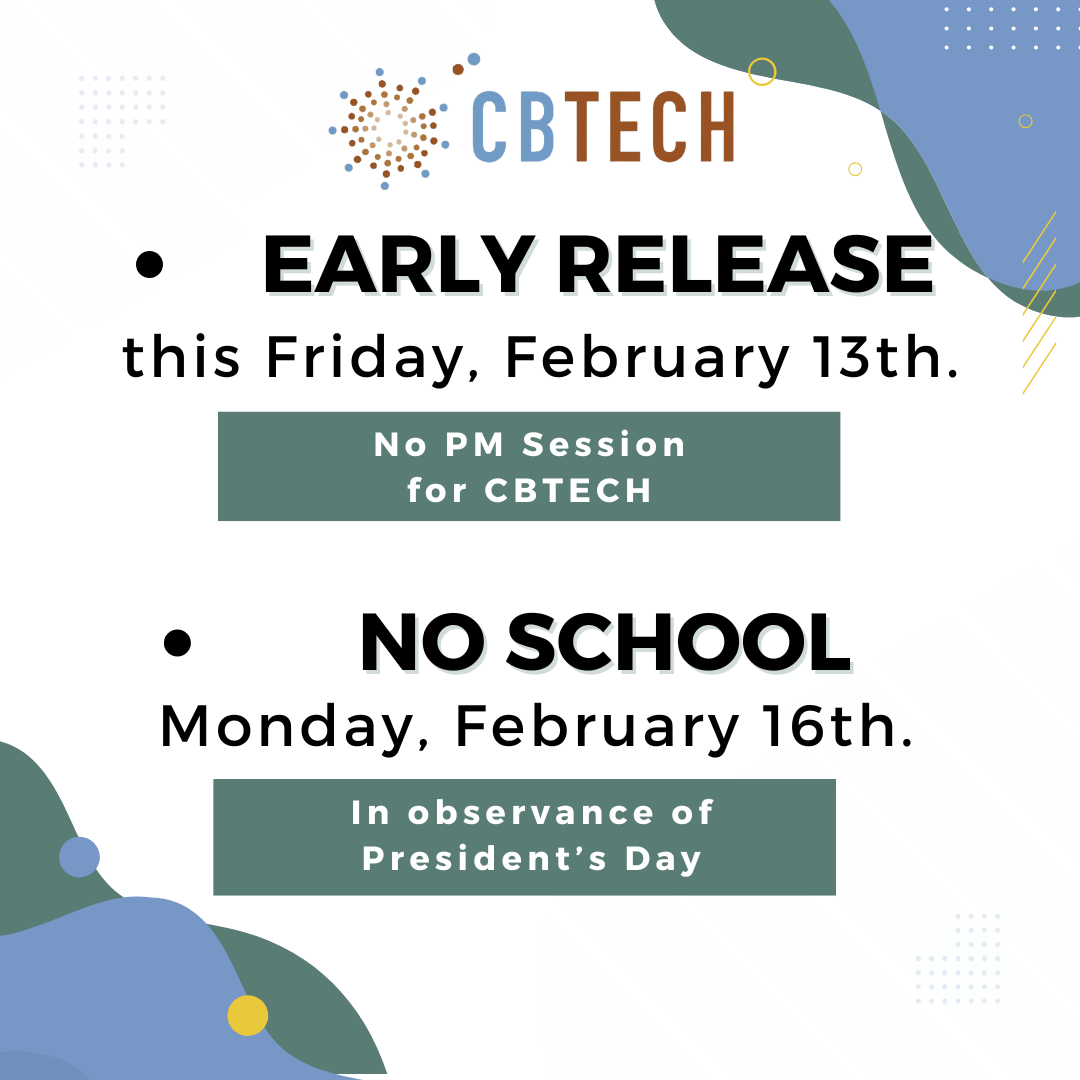 CBTECH students & families, this is a reminder that we have Early Release tomorrow, Friday, February 13. There will be NO PM Session for CBTECH. Also, there will be NO SCHOOL on Monday, Februar...